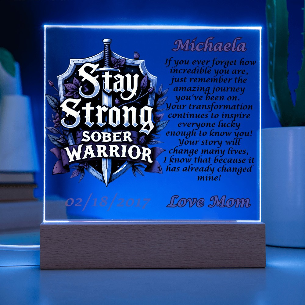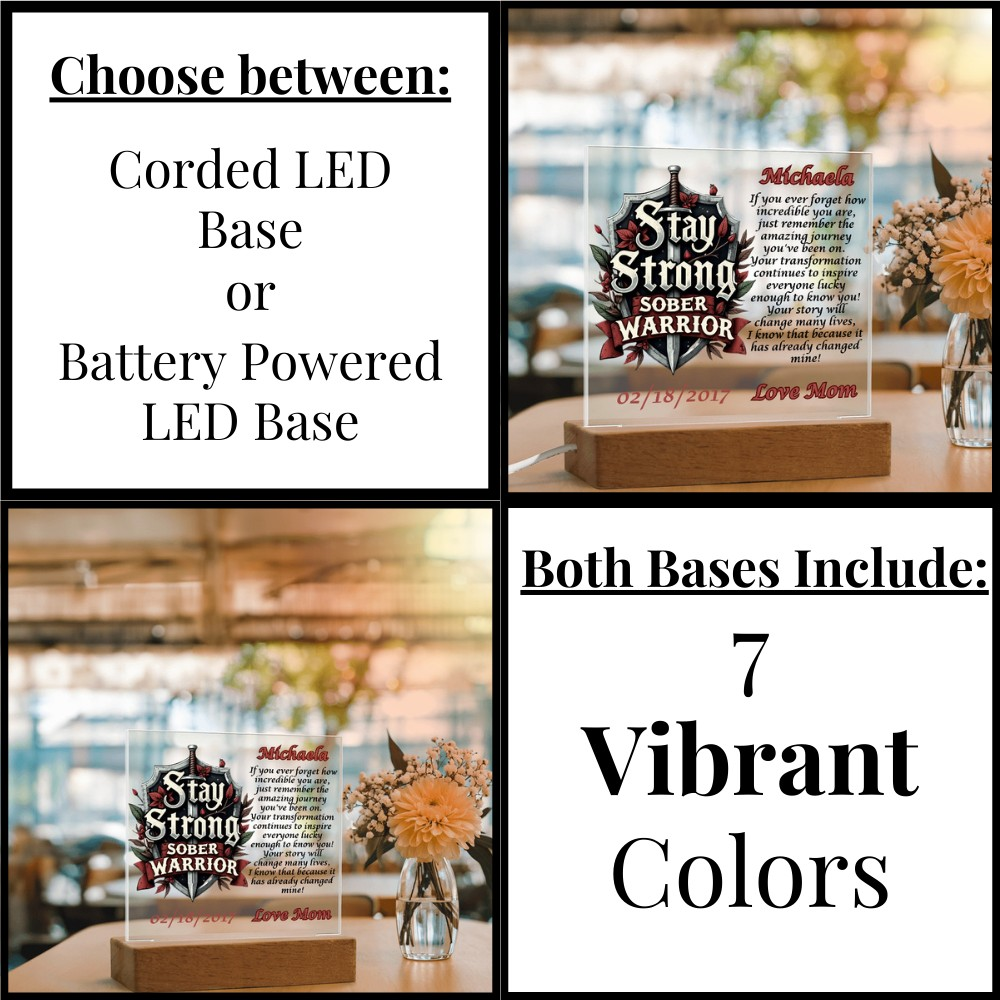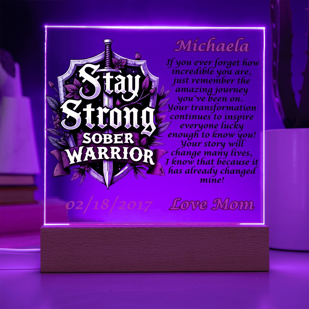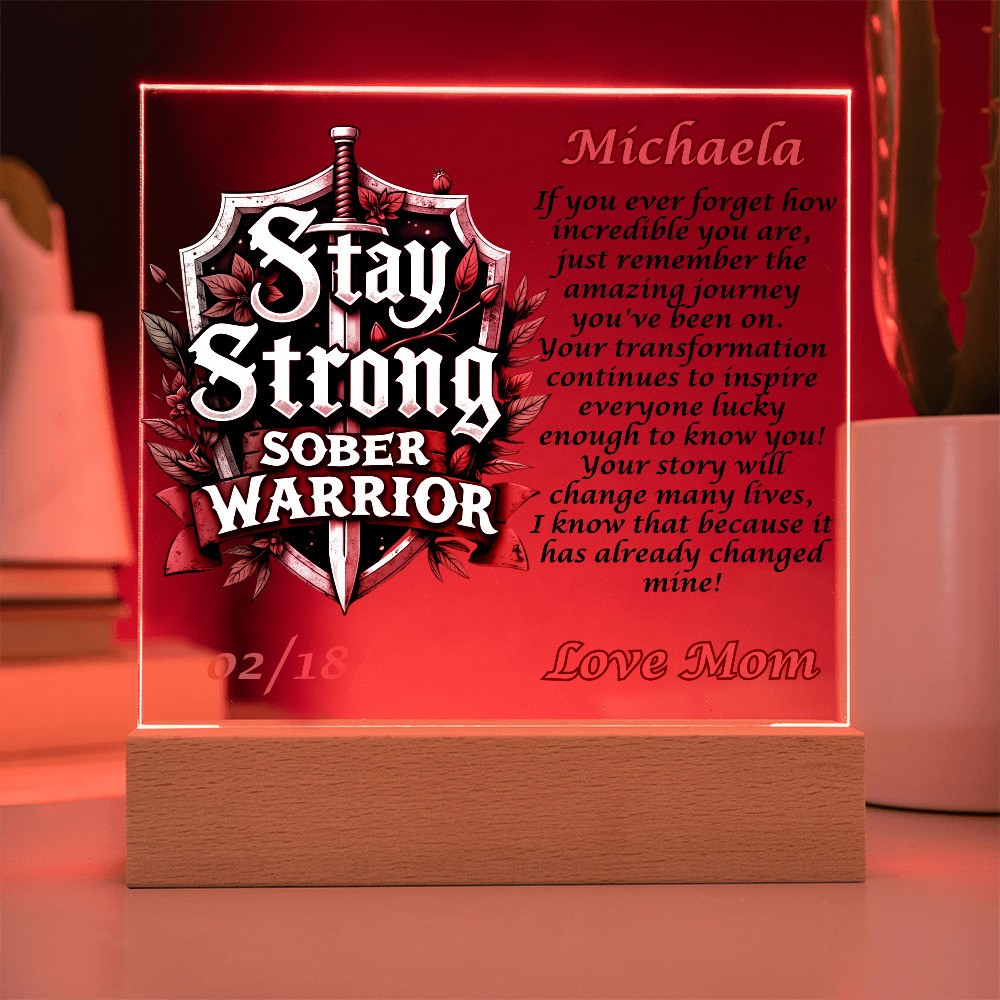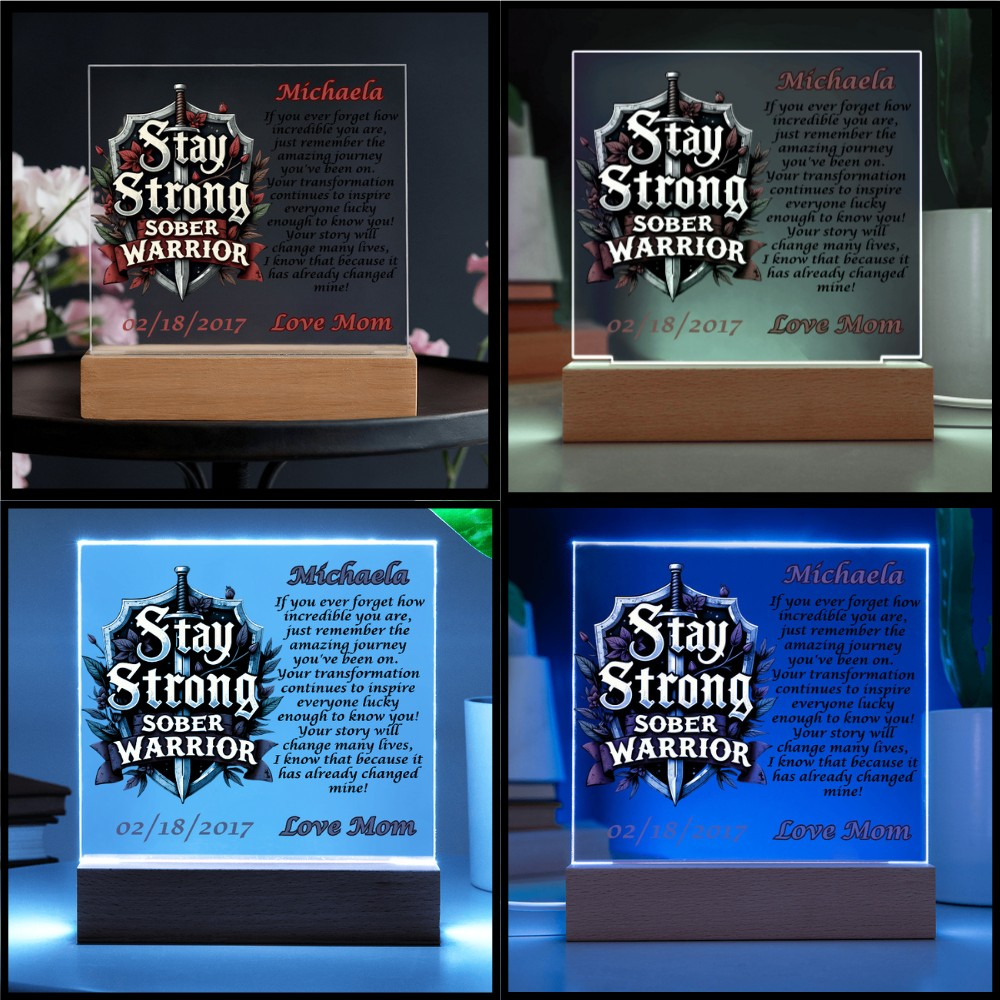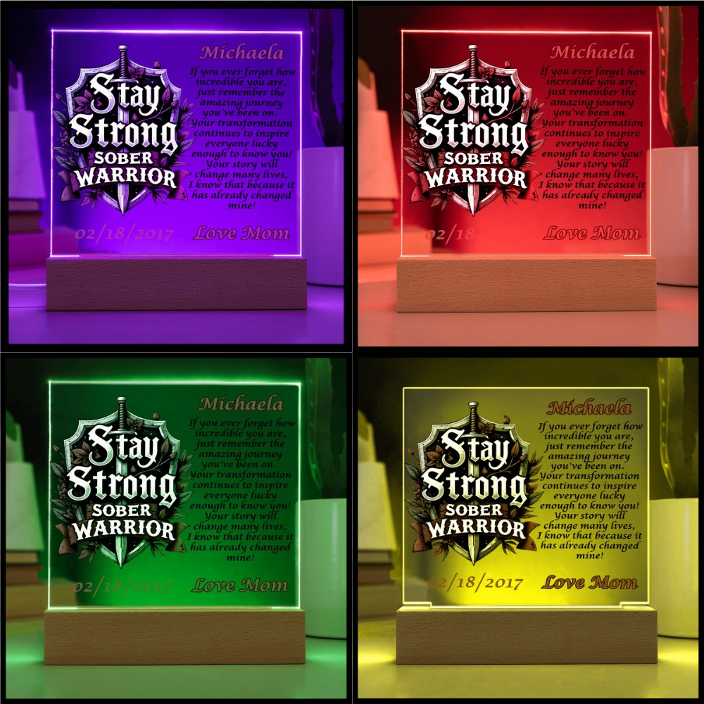 Honor the incredible journey of sobriety and resilience with our personalized "Stay Strong Sober Warrior" LED Acrylic Plaque. Designed to celebrate strength and progress, this keepsake is a daily reminder of how far someone has come—and how much they inspire others.