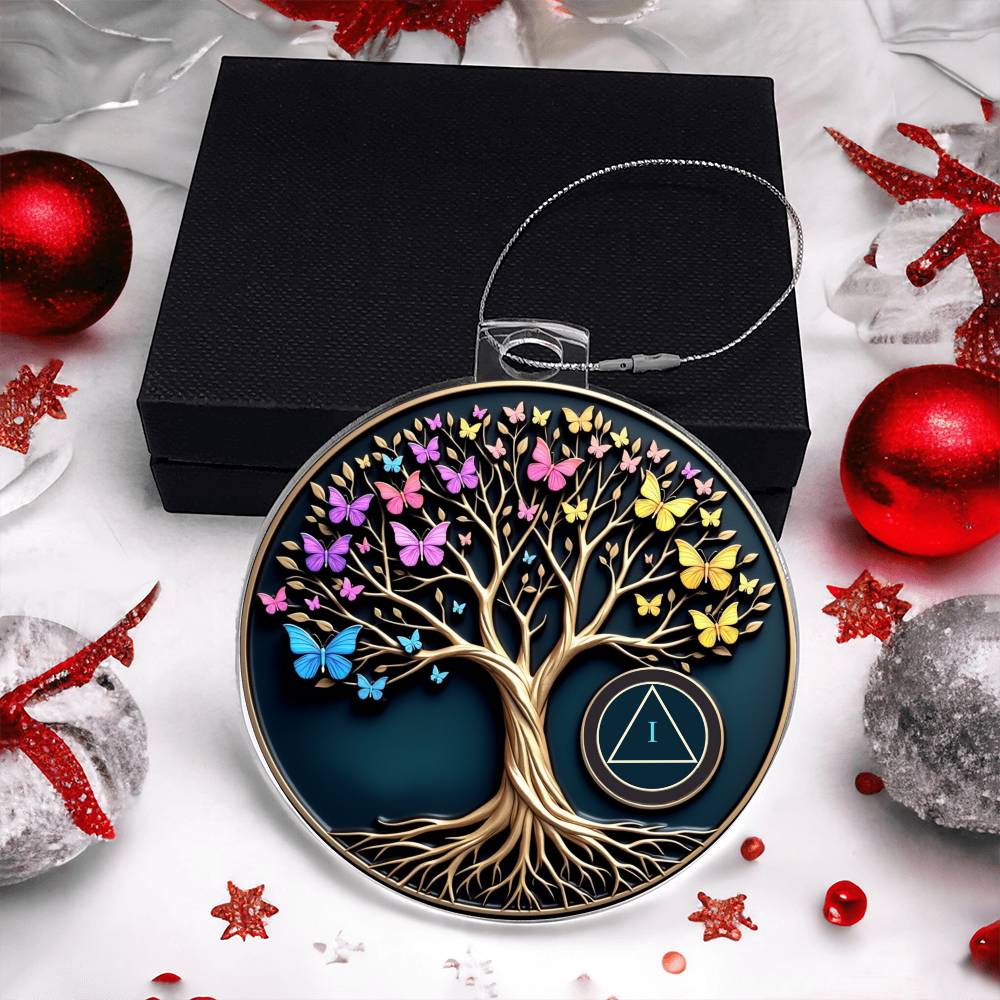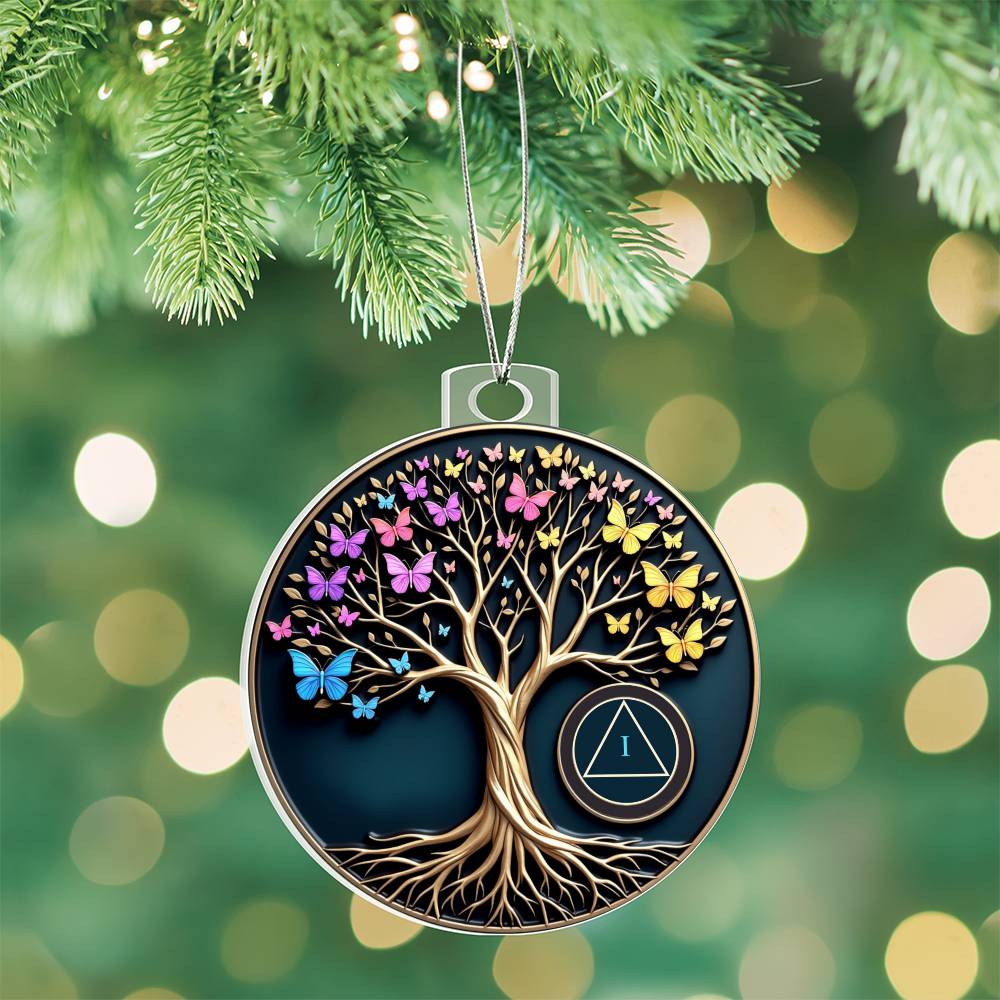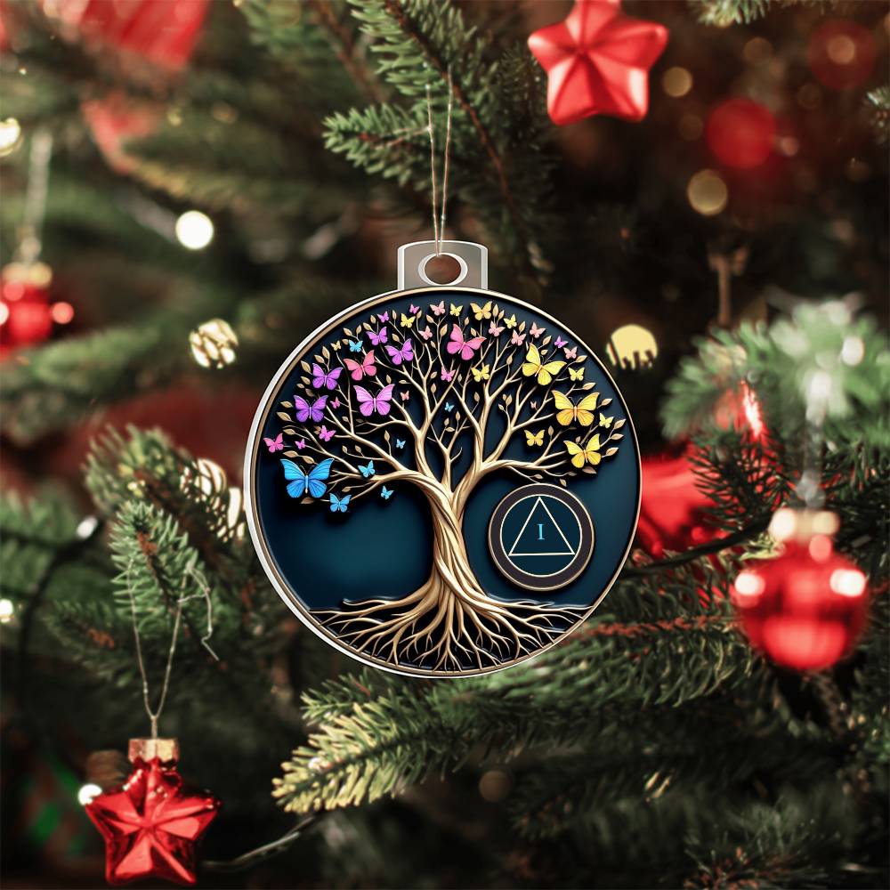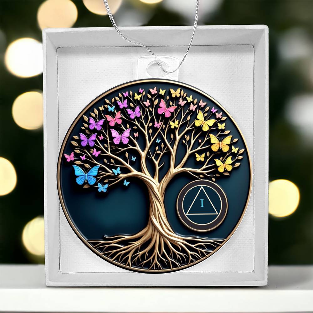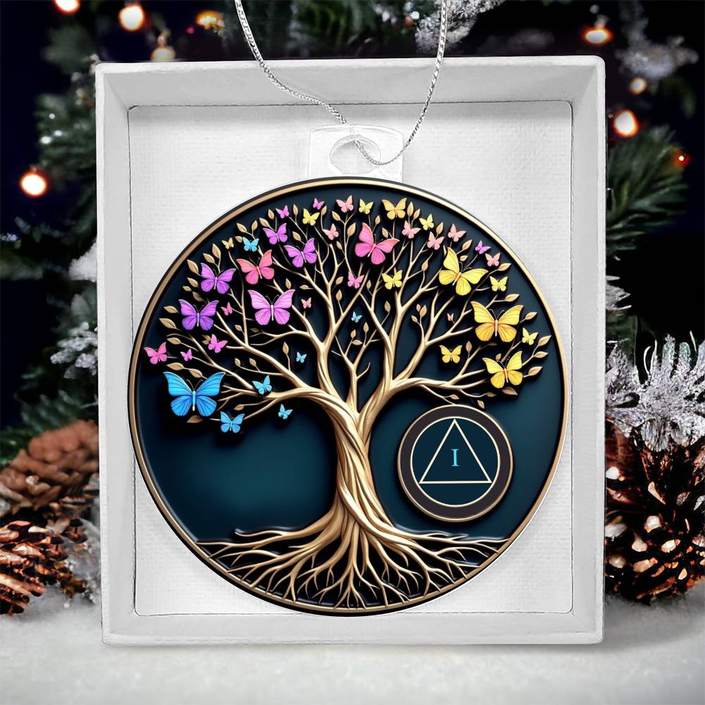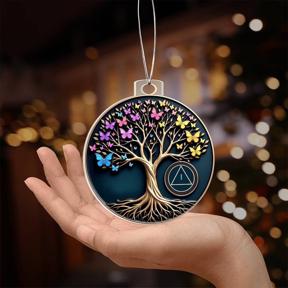 This stunning ornament is a profound symbol of recovery, resilience, and personal growth. Featuring a vibrant Tree of Life adorned with butterflies, it beautifully represents the journey of change and freedom from addiction. The customizable AA medallion at the base of the tree allows you to personalize the Roman numeral inside the triangle, marking any sobriety milestone from 1 year to decades of recovery.