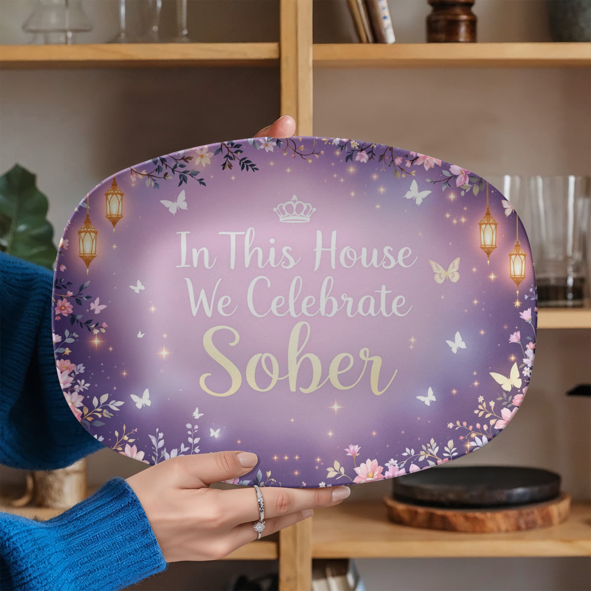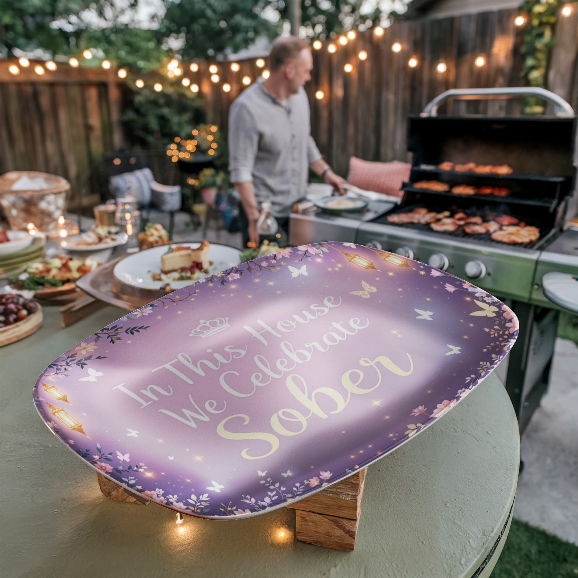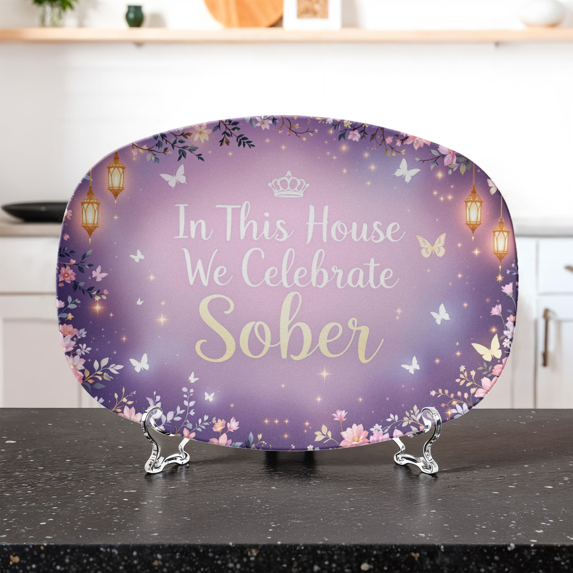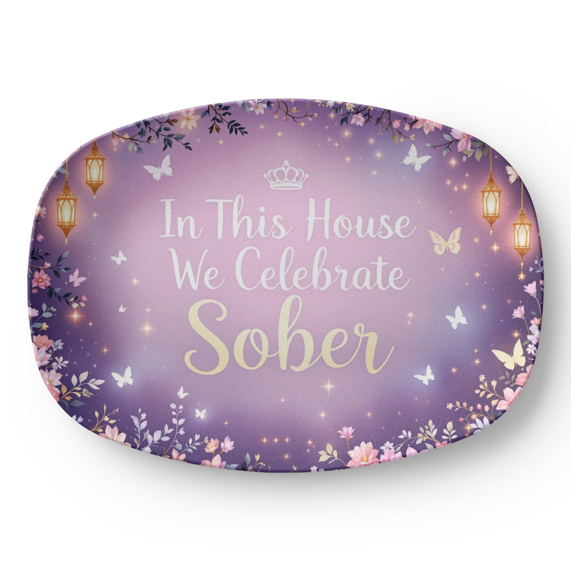 Sobriety is a transformation—a journey from darkness into light, and this dreamy, twilight-inspired platter celebrates that beautifully. With a soft lavender glow, golden lanterns, fluttering butterflies, and twinkling stars, it feels like a celebration pulled straight from a fairytale.