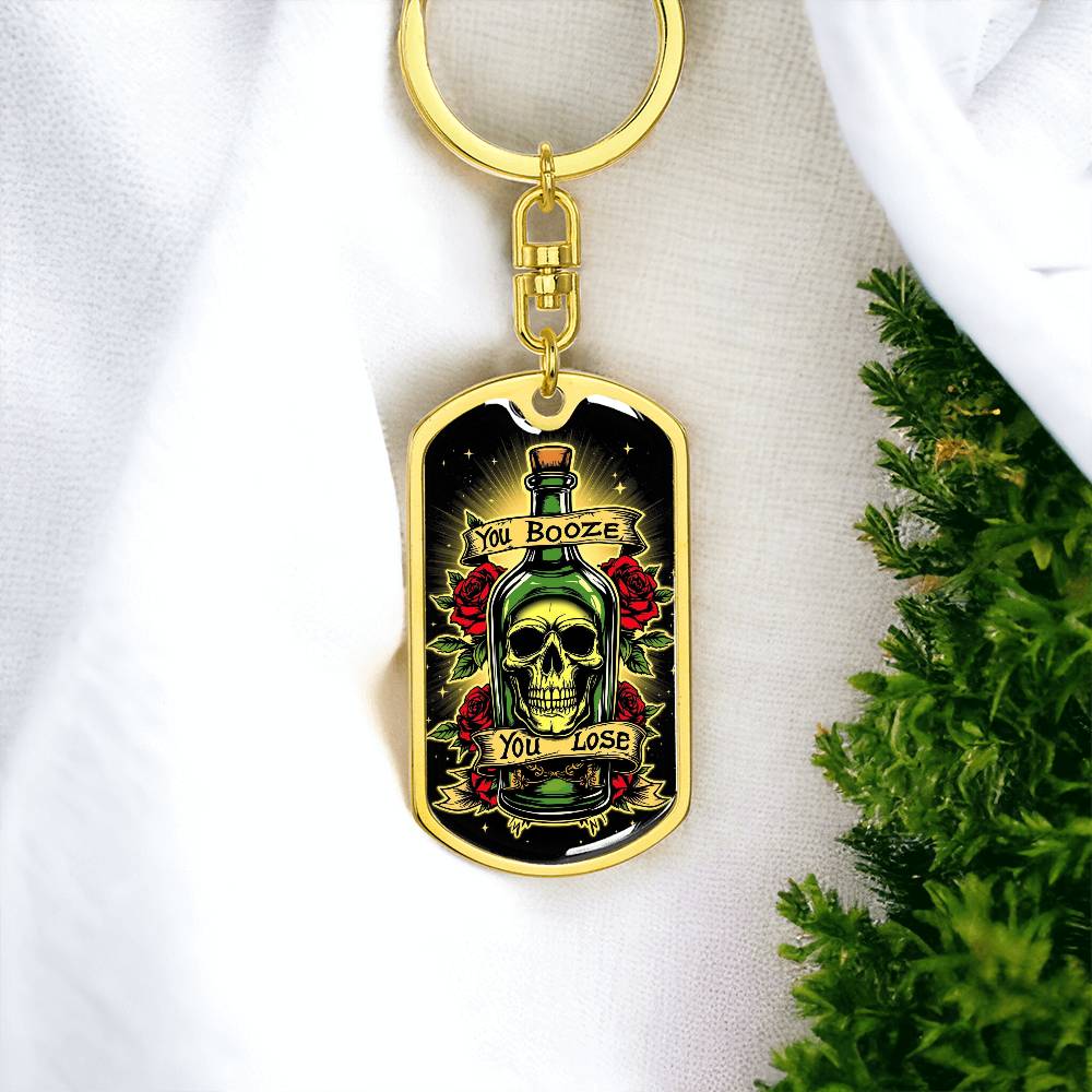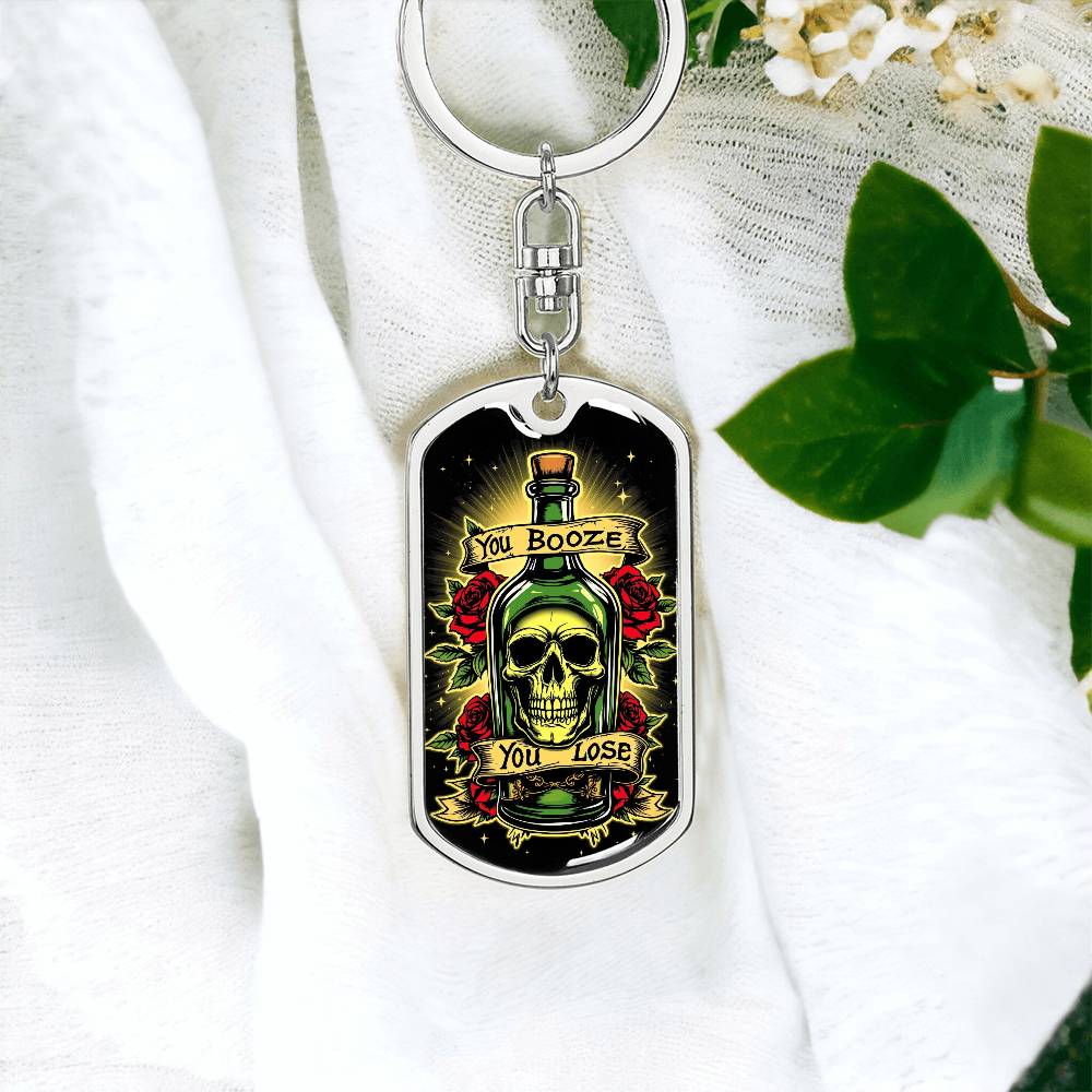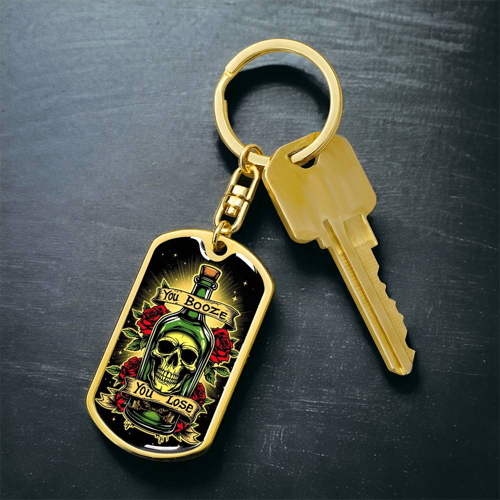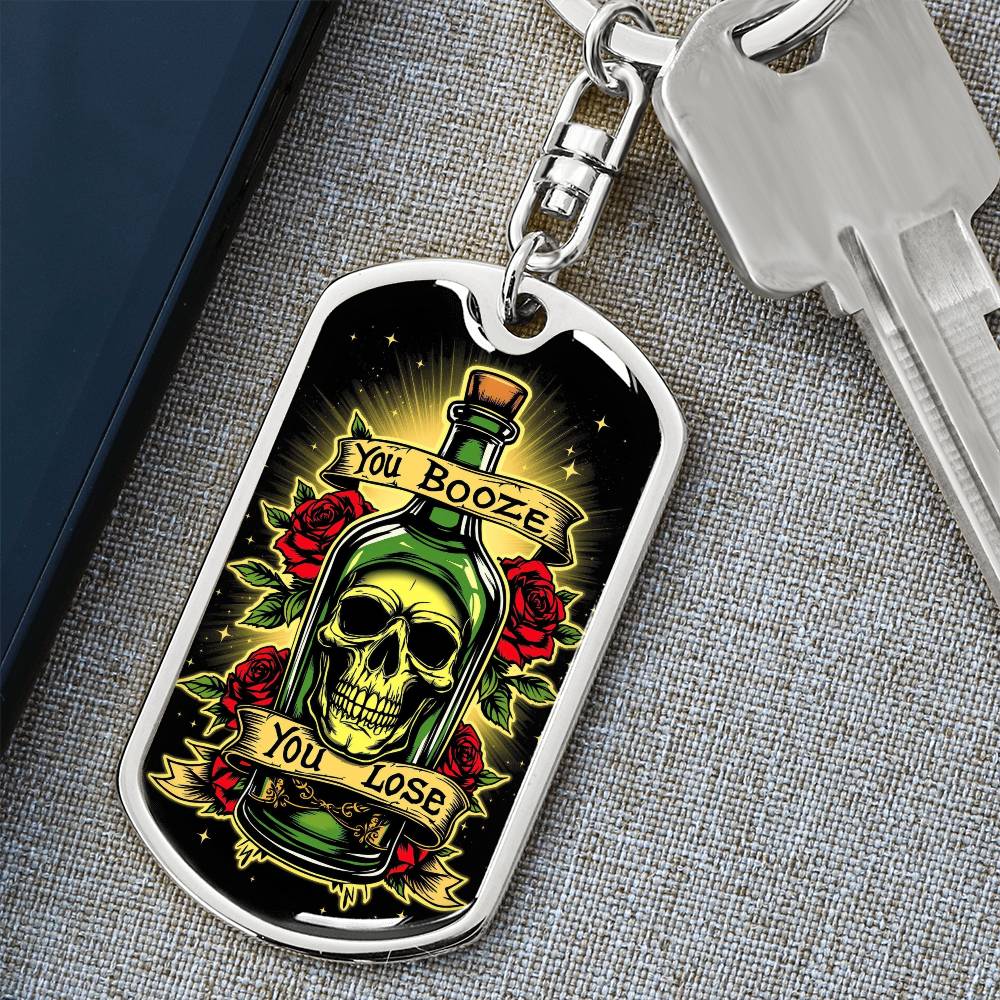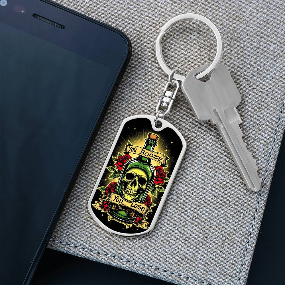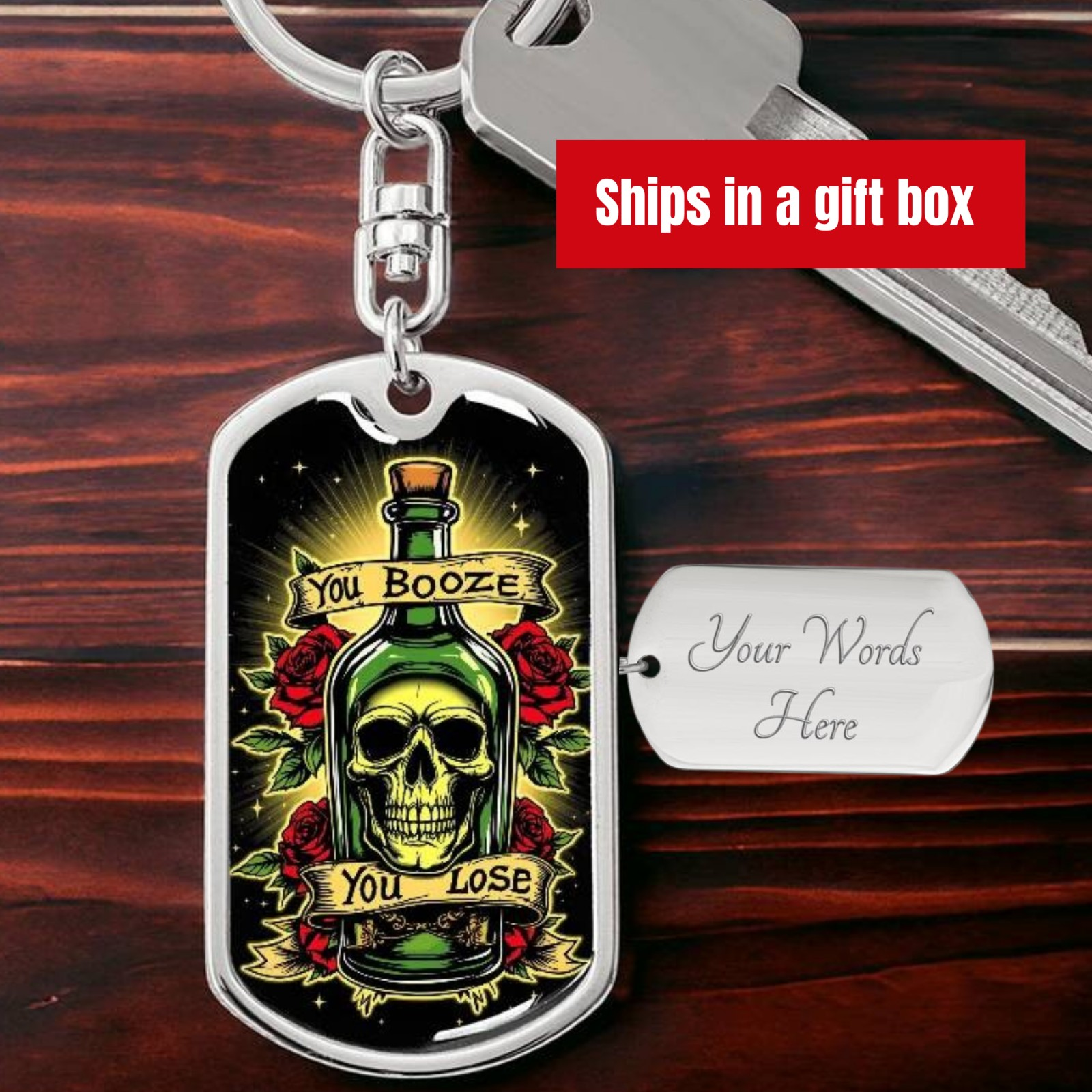 The You Booze, You Lose Keychain is a striking and powerful statement for anyone committed to their sobriety journey or wanting to support a loved one in theirs. Featuring an unchangeable front design with a skull and roses wrapped around a stark reminder, this piece serves as a visual representation of resilience, accountability, and hard-earned strength.