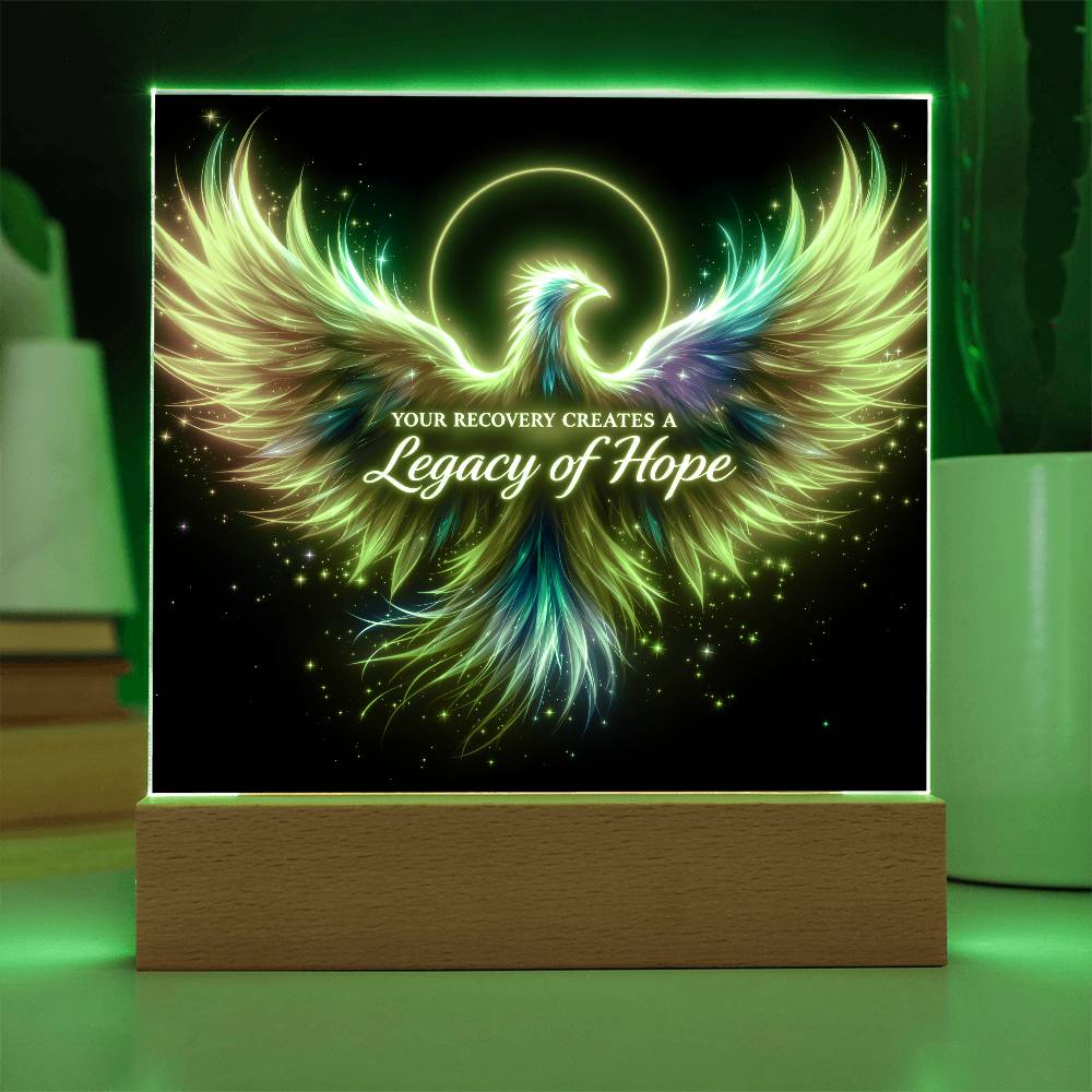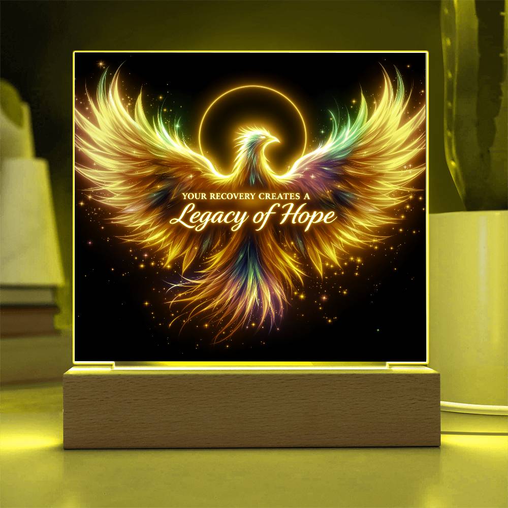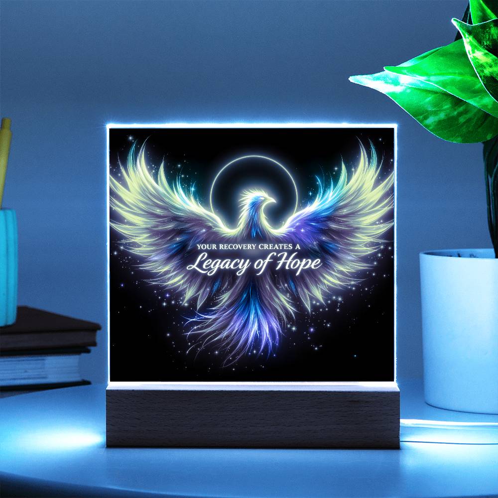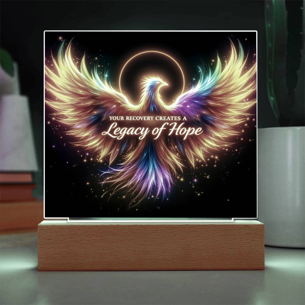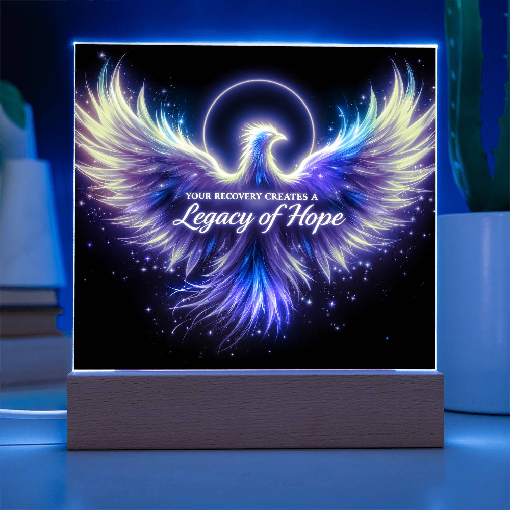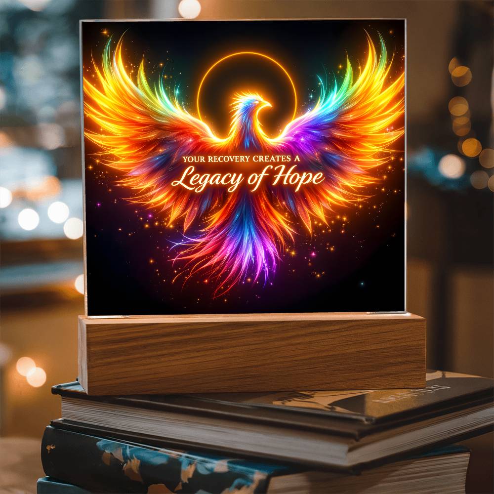 Celebrate the powerful journey of recovery with this breathtaking LED acrylic plaque. Featuring a radiant phoenix bursting with vibrant colors and the inspiring message, “Your Recovery Creates a Legacy of Hope,” this plaque symbolizes resilience, rebirth, and the light of hope carried forward. The LED glow beautifully enhances the phoenix design, making it an extraordinary and uplifting piece for any space.